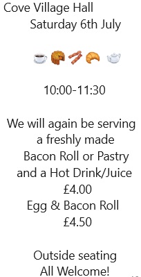 6th July -1st Saturday drop in for Tea/Coffee Bacon Baps/Pastries and more!